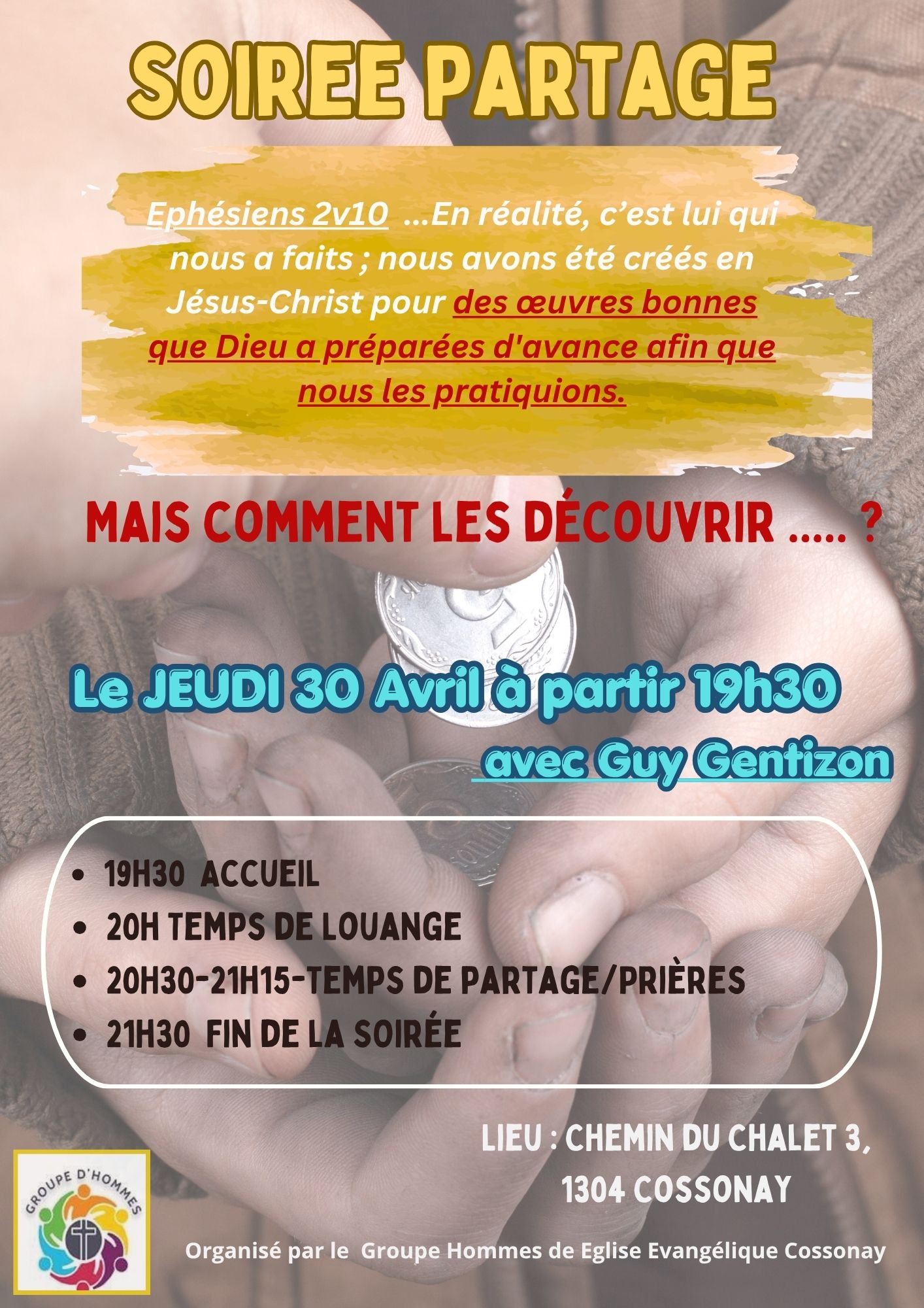 Soirée dans nos locaux. Guy Gentizon apportera un message sur Ephésiens 2.10. Accueil dès 19h30, début de la soirée à 20h00, fin vers 21h30. Flyer ici.